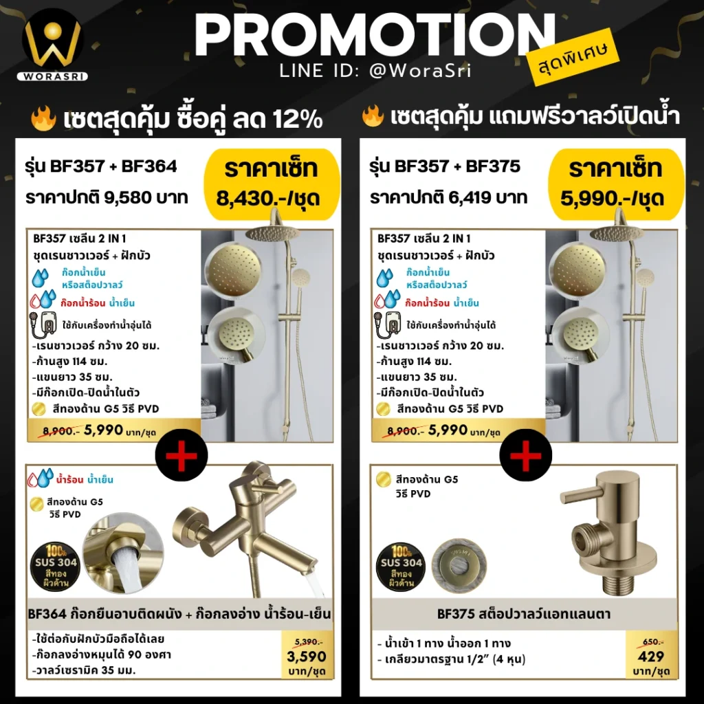 - ดีไซน์แบบ Complete Look คุมโทนห้องน้ำได้ 100% ปัญหาใหญ่ของคนทำบ้านคือ “สีทองแต่ละร้านไม่เท่ากัน” แต่ที่ WoraSri เรามี อุปกรณ์ห้องน้ำครบวงจร ในเฉดสีเดียวกัน