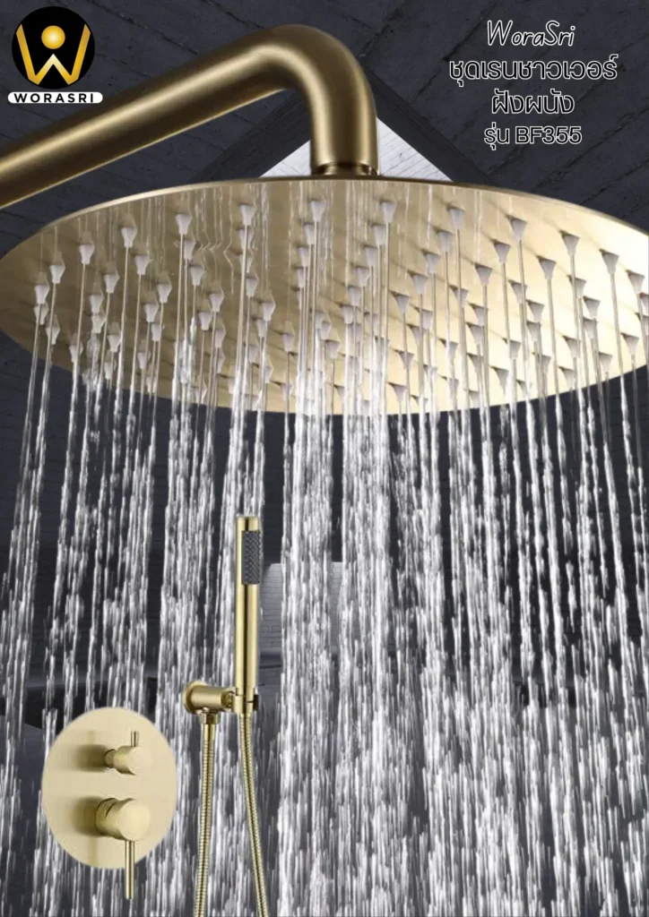 - Gold & Black (ลุคทันสมัย Modern Luxury): เพิ่มความเท่และดูสุขุมด้วยการใช้ เรนชาวเวอร์สีทอง ตัดกับผนังสีเข้มหรือสีดำ ช่วยขับให้สีทองโดดเด่นและดูโฉบเฉี่ยวมากยิ่งขึ้น