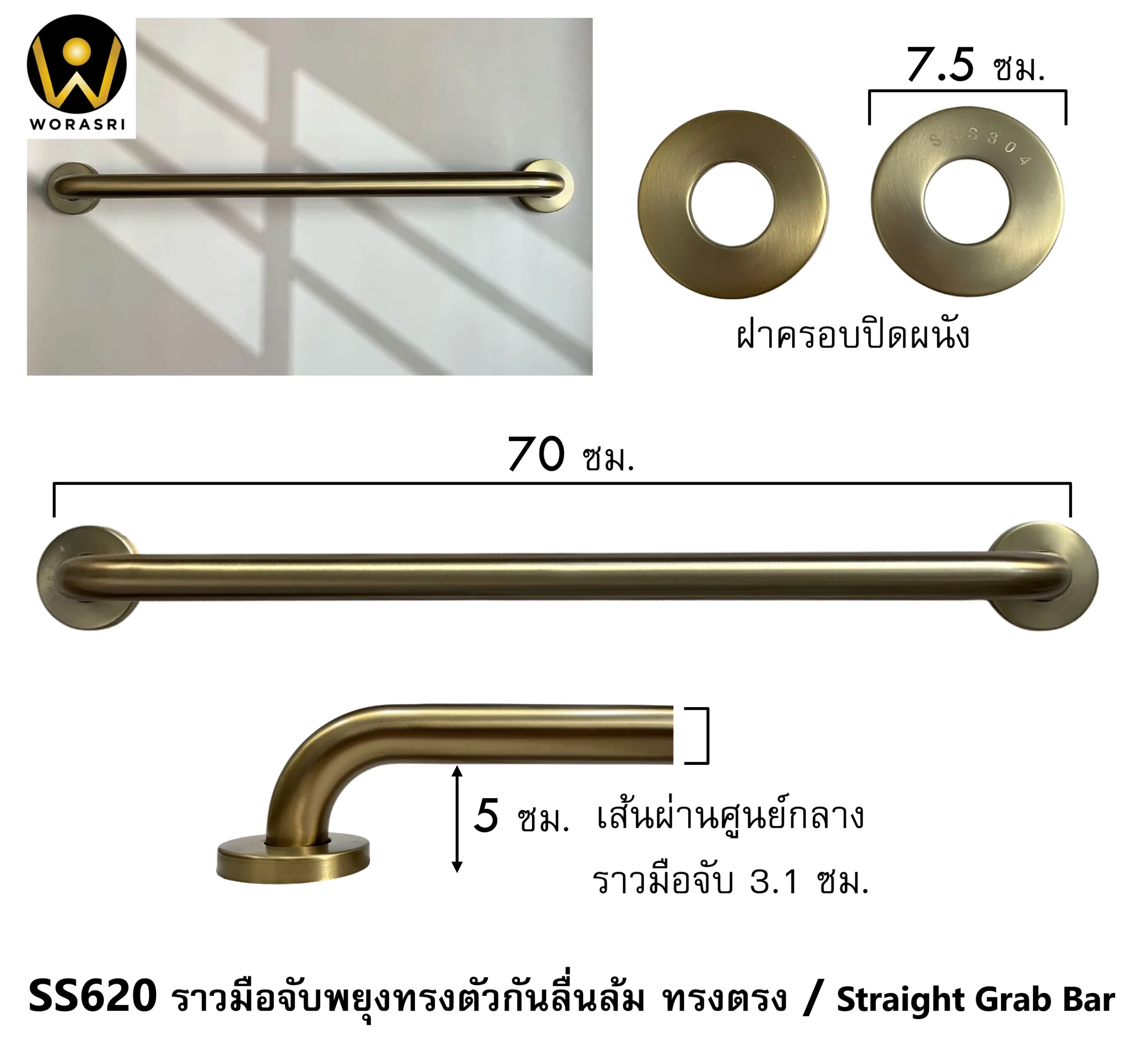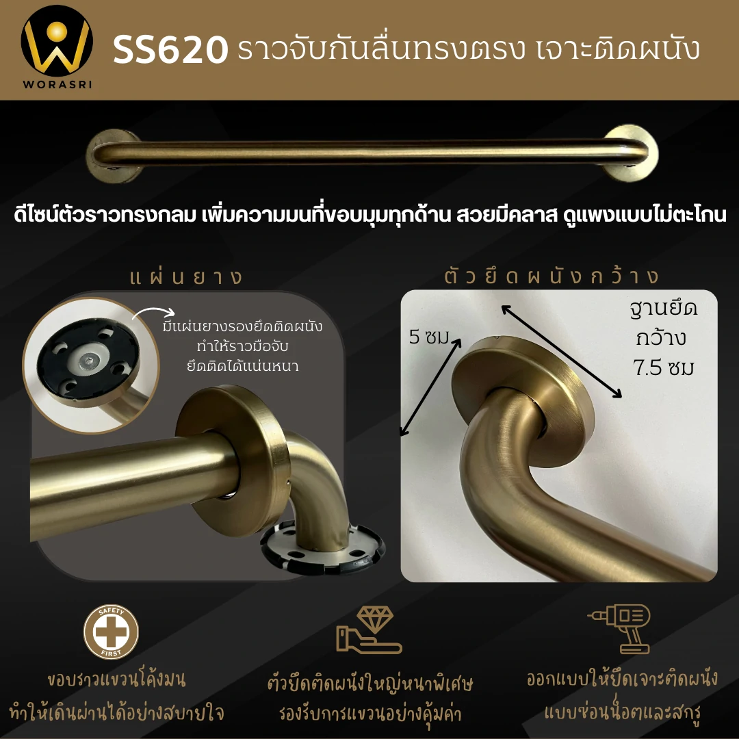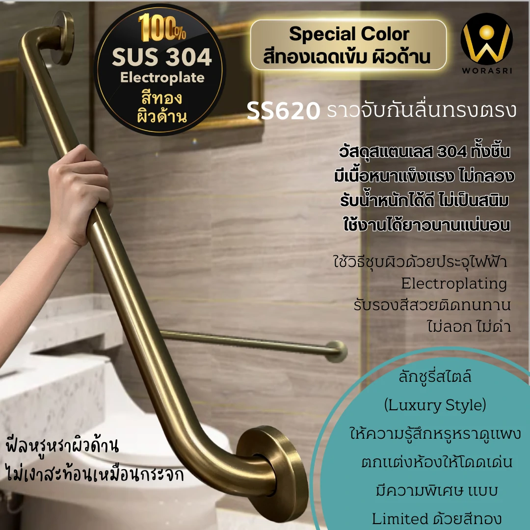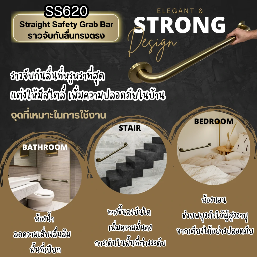 ราวมือจับพยุงทรงตัวกันลื่นล้มติดผนังทรงตรงสีทองด้าน ความปลอดภัยที่จับต้องได้ เมื่ออายุเพิ่มขึ้นร่างกายก็เริ่มทรุดโทรมการเคลื่อนไหวและการทรงตัวอาจไม่มั่นคง และเสี่ยงต่อการลื่นล้มโดยเฉพาะในห้องน้ำที่เป็นพื้นที่อันตราย ราวมือจับพยุงทรงตัวกันลื่นล้มทรงตรงไอเทมที่ตอบโจทย์เพิ่มความสะดวกในการเคลื่อนไหวแล้วยังช่วยลดความเสี่ยงจากอุบัติเหตุเหมาะสำหรับทุกคนไม่ว่าจะเป็นผู้สูงอายุ คนพิการ หรือผู้ที่มีปัญหาการเคลื่อนไหวรวมถึงผู้หญิงตั้งครรภ์ ราวมือจับสีทองด้าน สะดุดตา มองเห็นง่ายเพิ่มความสวยงามให้กับพื้นที่และบ้านของคุณได้อย่างลงตัว ผลิตจากสแตนเลส 304 เนื้อวัสดุหนาพิเศษแข็งแรงทนทานรองรับน้ำหนักได้มาก เคลือบด้วยกระบวนการ Electroplated เพื่อความเงางามทนทานต่อการสึกหรอและใช้งานได้ยาวนาน
